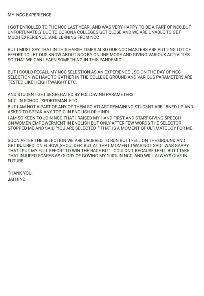 My experience in NCC was always good...I learnt discipline,time management and being confident...and I also learnt a different thing that is aeromodelling .That was my best experience in my life