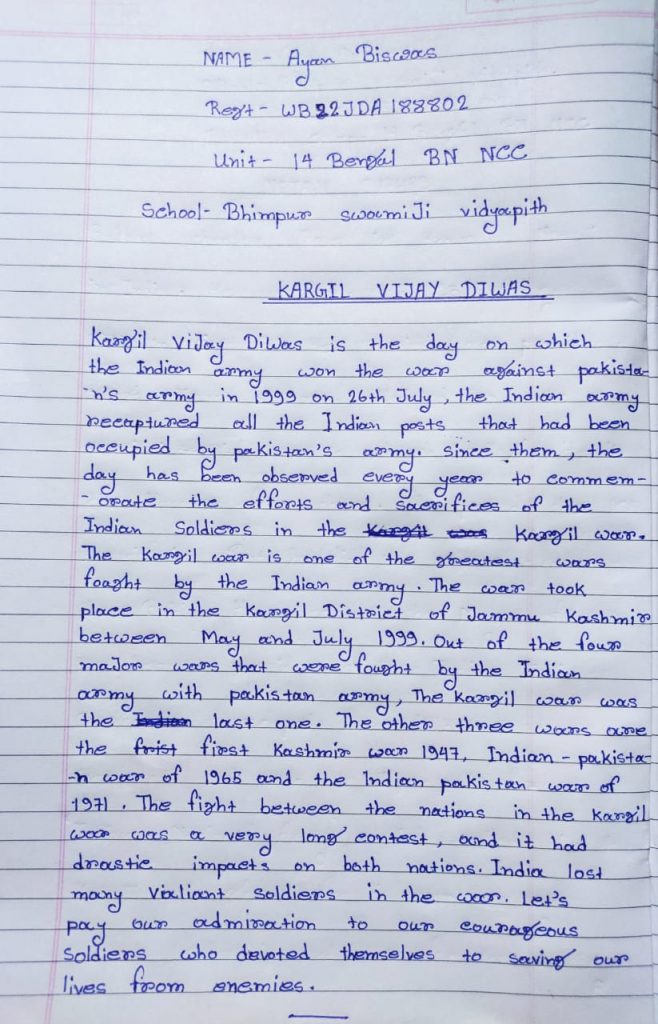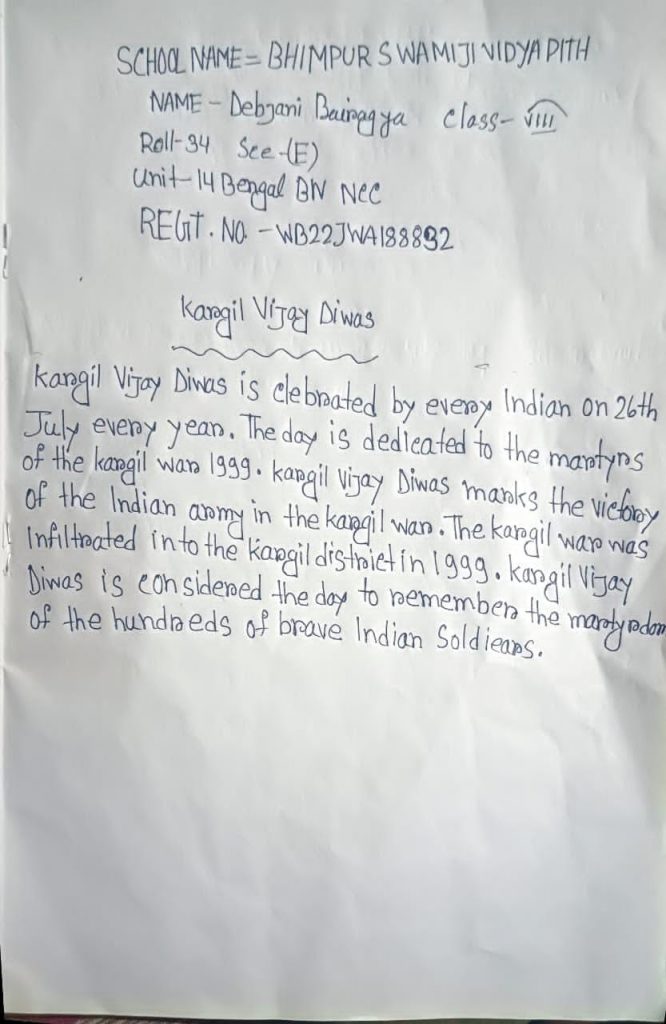 I am a NCC jda cadet of 14 Bengali BN NCC. My Regimental number and name is WB 22jda188802, Ayan Biswas. My school name is Bhimpur Swamiji Vidyapith.