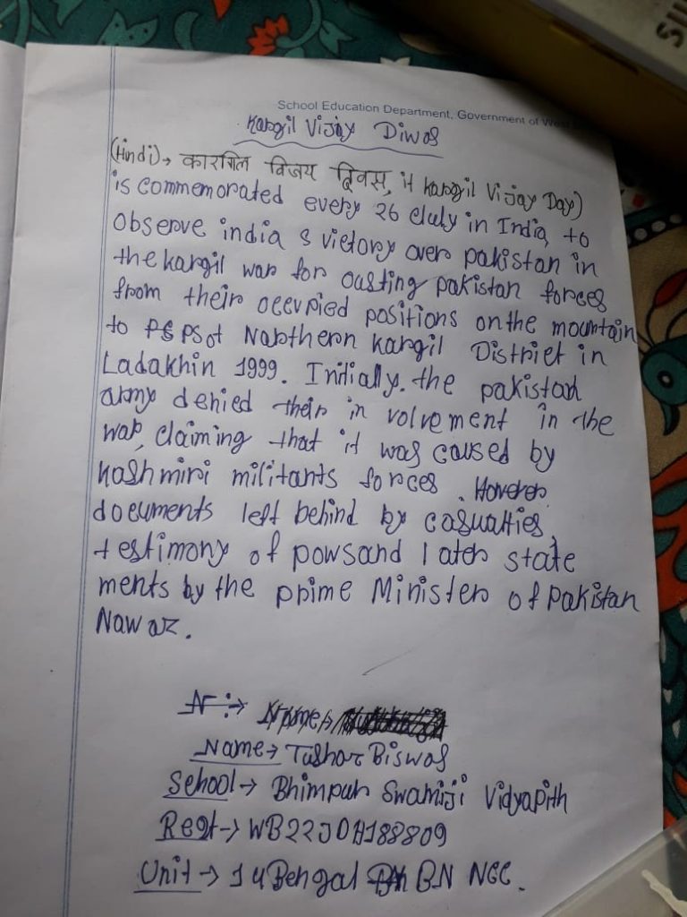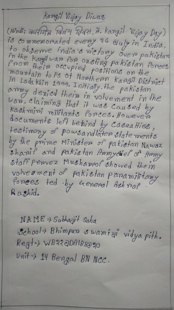 I am a NCC jda cadet of 14 Bengali BN NCC. My Regimental number and name is WB 22jda188809, Tushar Biswas. My school name is Bhimpur Swamiji Vidyapith.