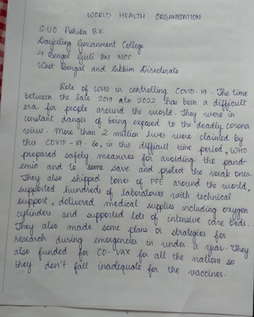 NAME - CADET SWASTIKA DAS REGIMENTAL NO - WB21SWA193193 DURGAPUR WOMEN'S COLLEGE 5 BENGAL GIRL'S BATTALION BURDWAN GROUP WEST BENGAL AND SIKKIM DTE