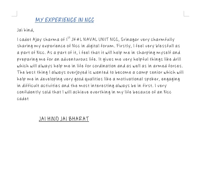 Cadet Ajay sharma Of 1st jk&l NU Ncc, srinagar Jk19SDN267000 Presents an article on my experience in Ncc