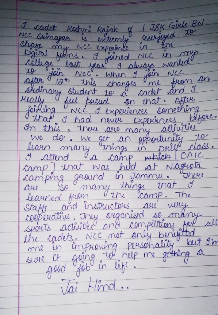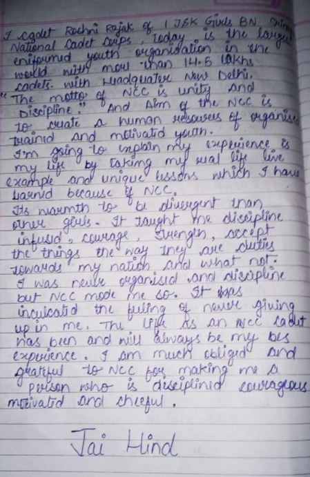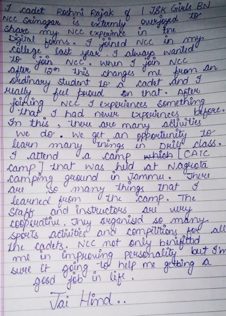 I cadet Roshni Rajak from GCW Gandhi Nagar Jammu 1J&k Bn NCC Srinagar Here to represent my article on the experience in my ncc life from 2020.