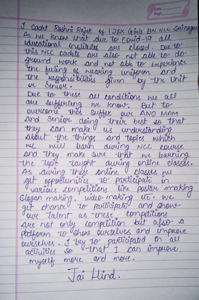 I cadet Roshni Rajak from GCW Gandhi Nagar Jammu. 1J&K Girls Bn NCC Srinagar Here to represent my article on the experience in my life from 2020.