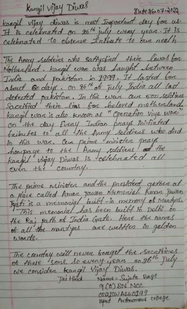 Name -Sujata Bage Institute-Ispat Autonomous college Rourkela Unit-9(O)BN NCC Reg no.-OD21SWA660199