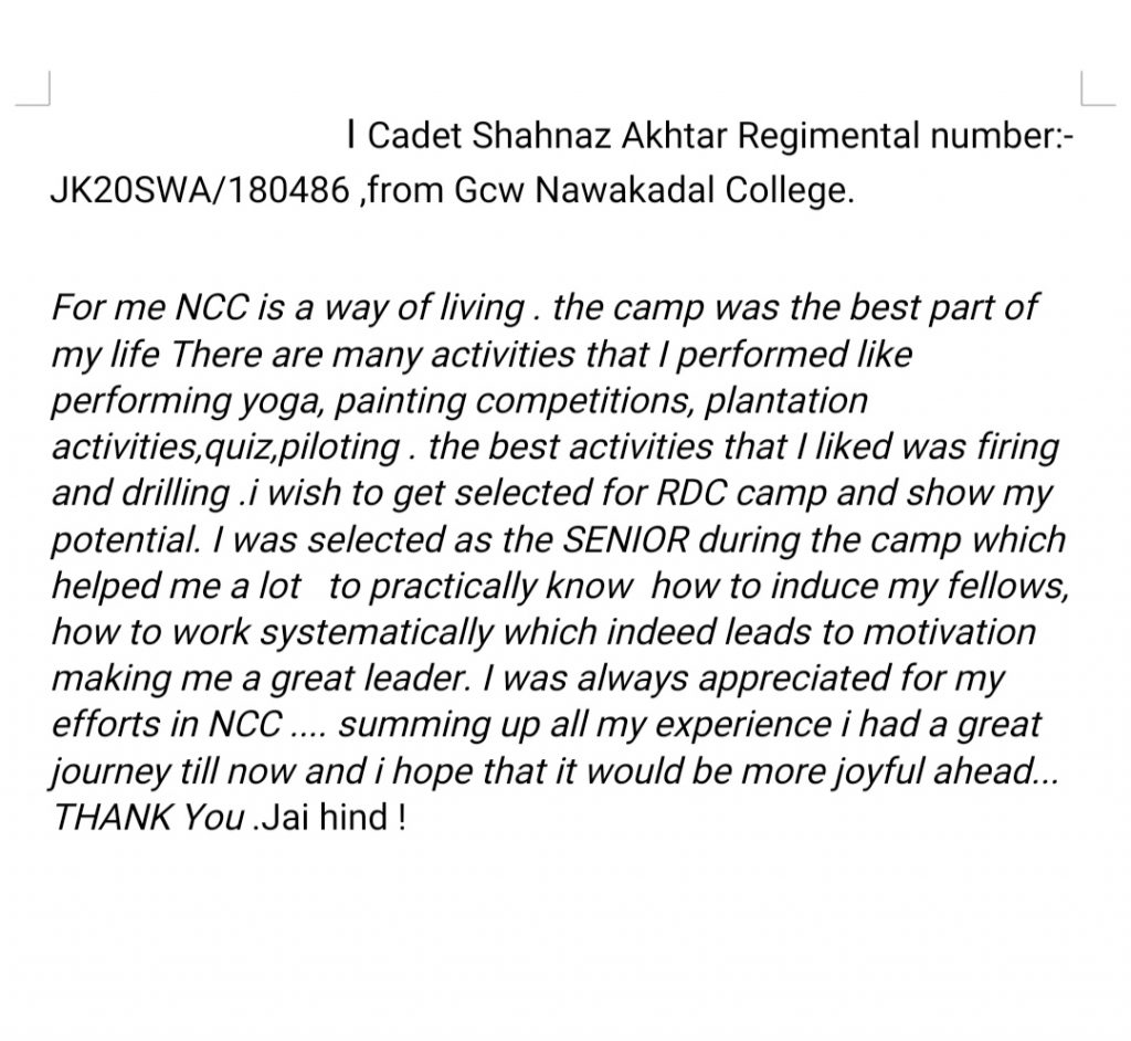 I Cadet Shahnaz Akhtar Reg No.JK20SWA/180486 From GCW NAWAKADAL COLLEGE