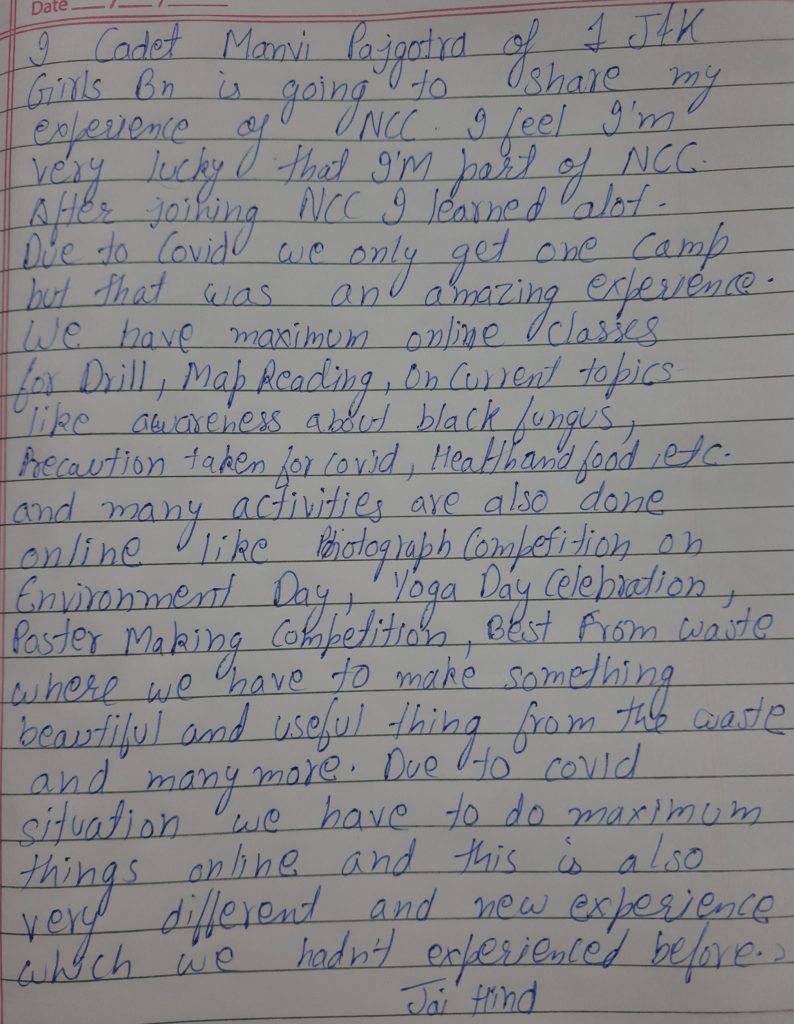 I cadet Manvi Pajgotra with regno JK20SWA/187047 here to share my experience of NCC