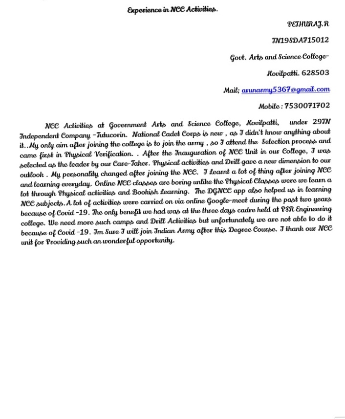 CADET ESTHER ELIZABETH MATHEW KL/SW/20/202789 ST. MARY'S COLLEGE, SULTHAN BATHERY 5(K) BN NCC, WAYANAD CALICUT GROUP KERALA&LAKSHADWEEP DIRECTORATE