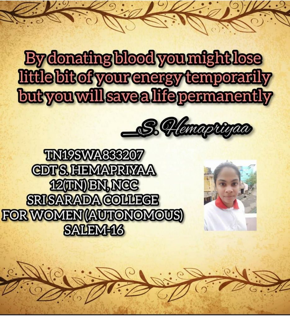 This is SGT S. Hemapriyaa TN19SWA833207 from Sri Sarada College For Women (Autonomous) Salem - 16. I belong to 12(TN) BN, Coimbatore group. TN , P & AN DTE This is my slogan for Blood donation day