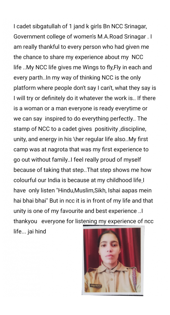 Jai hind ,I cadet sibgatullah from 1 j and k girls bn ncc srg ..sharing my ncc life experiences..