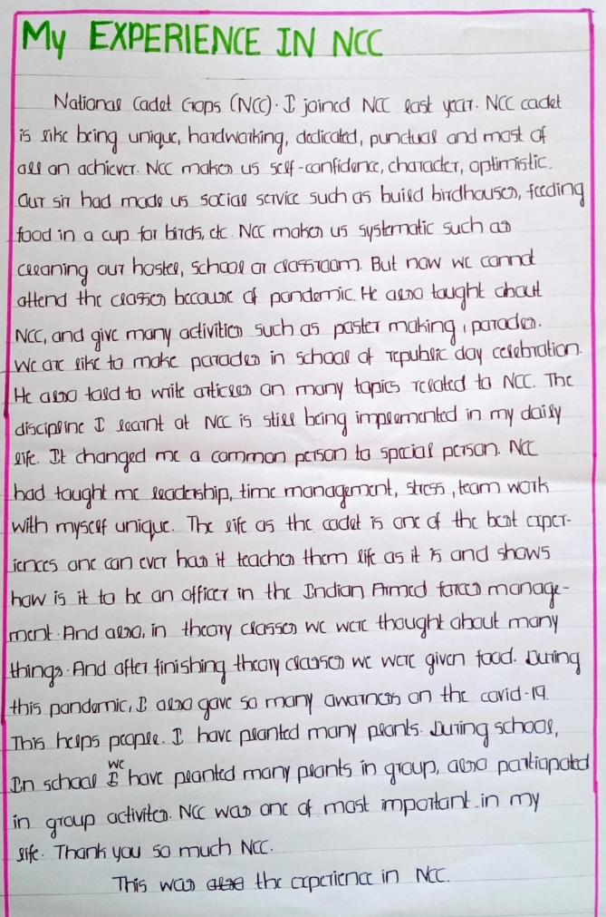 Name : Hrishika Class: 9th B School: jawahar Navodaya vidhyalaya mudipu dakshina kannada Activity : my experience in ncc