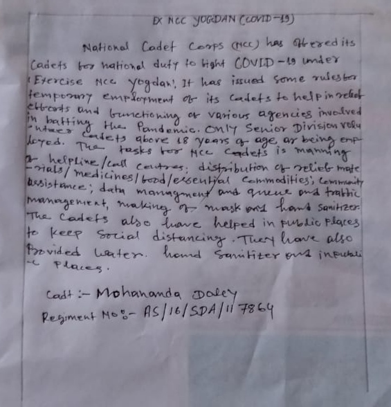 Name: Mohananda Doley Regiment No: AS16/SDA/117864 Unit: 9th ASSAM BN NCC, JORHAT