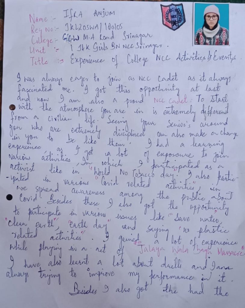 Ifra anjum(jkl20swa/180105)( 1j&k girls Bn Ncc srinagar) (GCW M.A road srinagar)