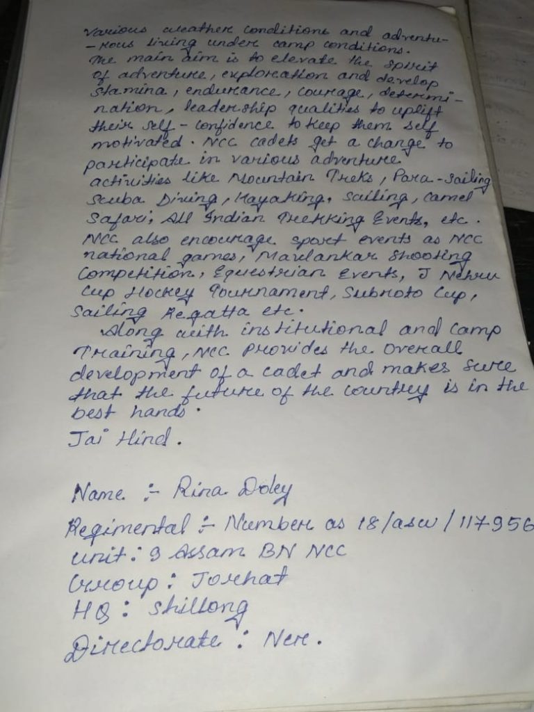 NAME : KABYASREE HAZARIKA Regimental No : AS/20/SWA/117366 RANK : CADET UNIT : 9 ASSAM BATTALIAON GROUP : JORHAT COLLEGE : CKB COMMERCE COLLEGE