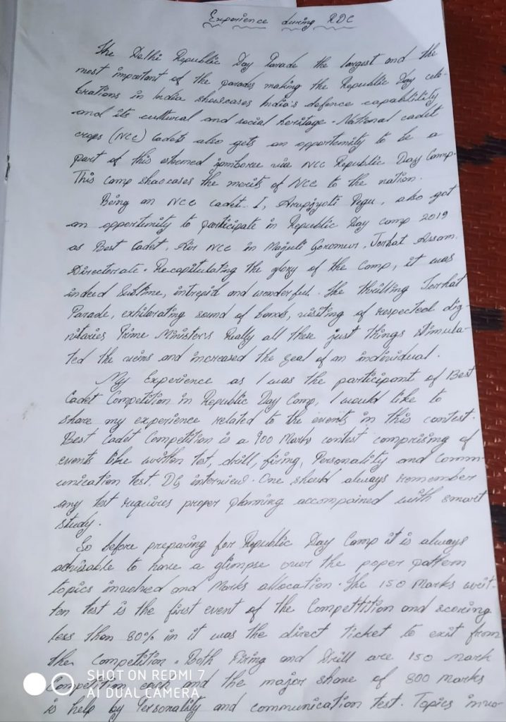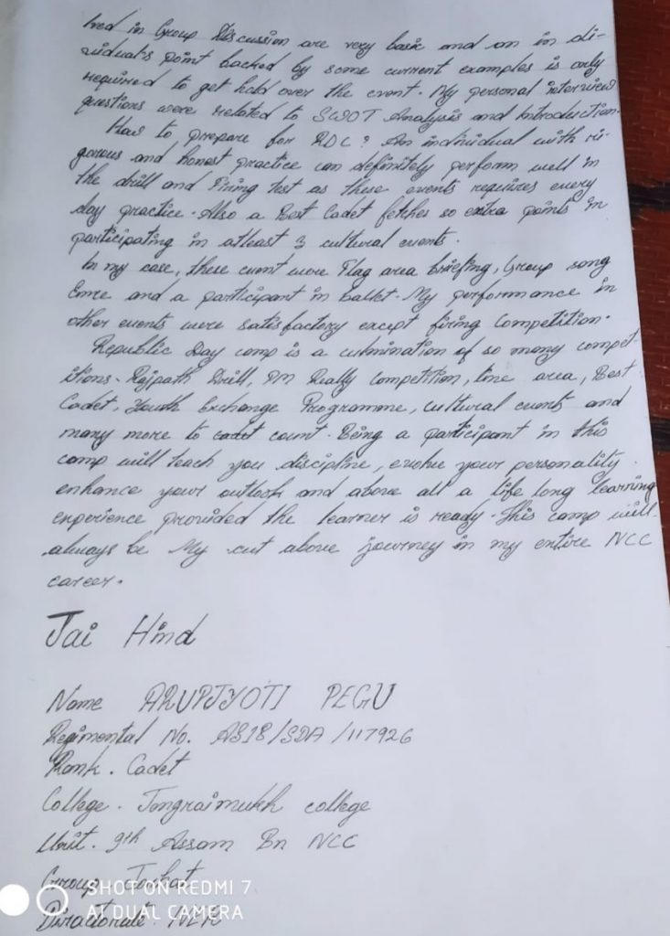 Name: Arupjyoti pegu Regimental Number: AS18/SDA/117926 College: Jengraimukh college Unit: 9th Assam Bn NCC Group: Jorhat