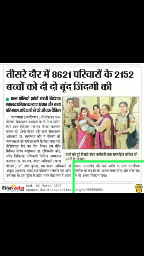 Jai hind everyone. 1st year cadet mamta Kumari of 8 PN BN NCC Phagwara ramgarhia collage give duty of polio drops