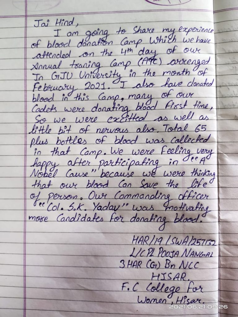 Cadet:jushi loying Reg no:As/19/SDA/117697 Unite:9Assam Bn ncc jorhat College:Dkdc