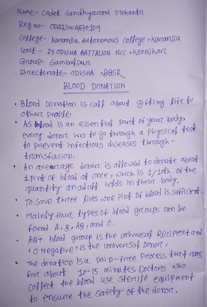 Name _ Cadet Sandhyarani Mohanta , Reg no _ OD21SWA870109 , College _ Karanjia Autonomous College , Karanjia , Unit _ 14 ODISHA BATTALION NCC , Keonjhar , Group _ Sambalpur , Directorate _ ODISHA , BBSR
