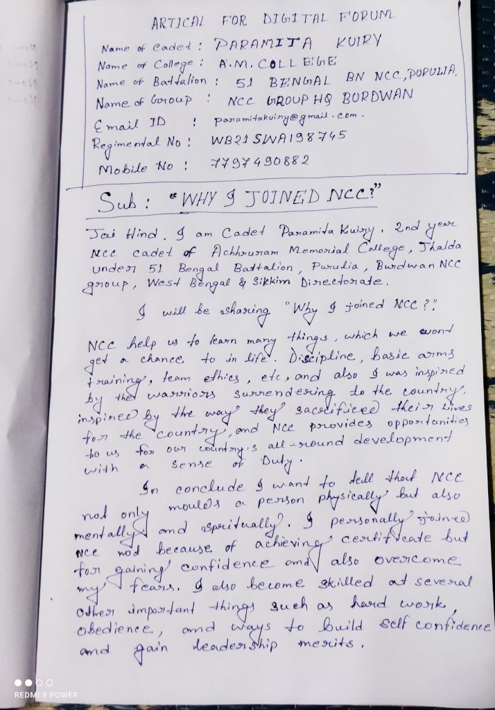 Name- paramita kuiry ,Reg.no- WB21SWA198745, Rank- SW, College name- Achhruram Memorial College, Battalion - 51 BENGAL BN NCC, Email ID -paramitakuiry@gmail.com
