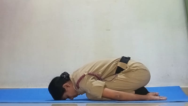 This is an image of Balasana (The Child's Pose) done by a cadet of Nirmala NCC 1st COY as part of the International Yoga Day on June 21 2021.