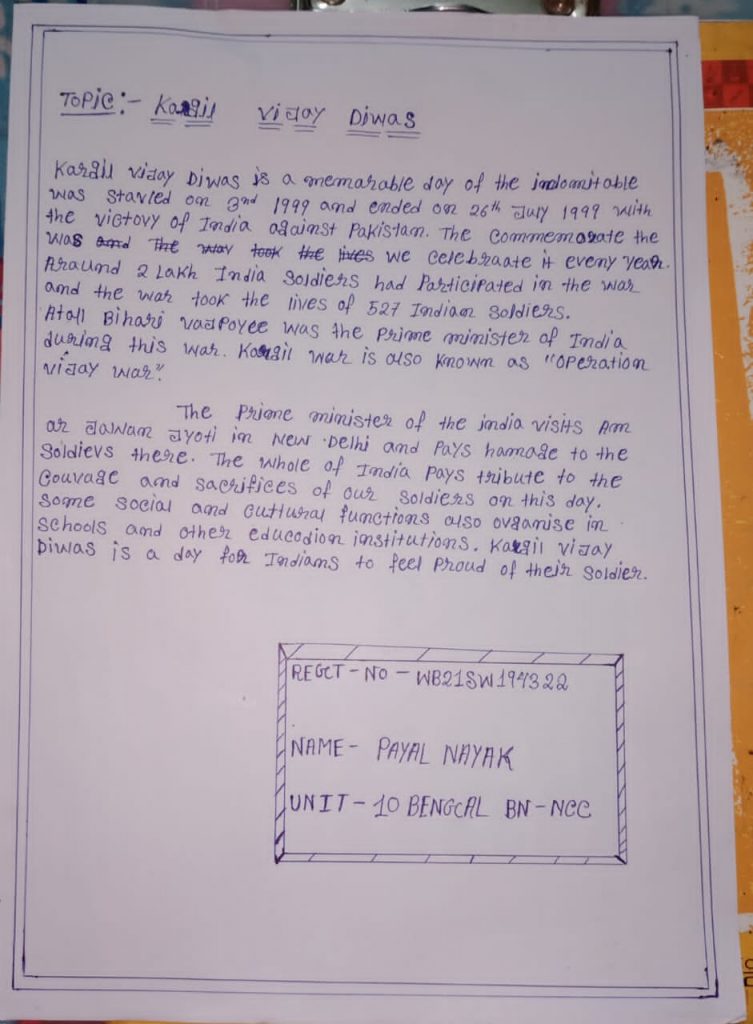 REG NO- WB21SWA194322,NAME-- PAYEL NAYAK, MANKAR COLLEGE, BATTALION- 10 BENGAL BN NCC ASANSOL
