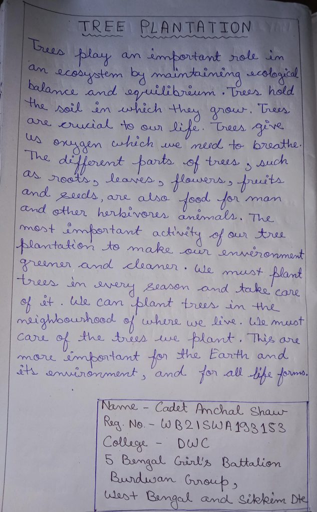 Name - Cadet Anchal Shaw Regimental No.- WB21SWA193153 College - Durgapur women's college 5 Bengal Girl's Battalion Burdwan Group, West Bengal and Sikkim Directorate