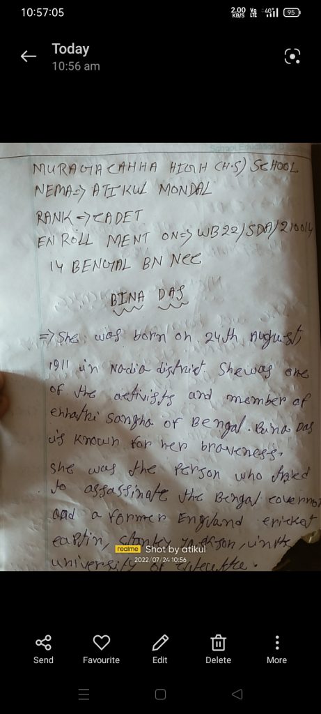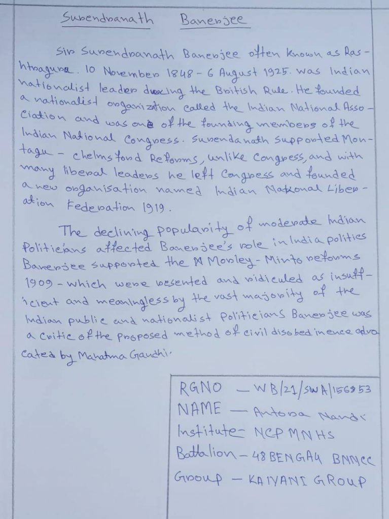 REGIMENTAL NO.- WB21SWA194157, NAME- MITA KUNDU , RANK- CDT, COLLEGE- TRIVENIDEVI BHALOTIA COLLEGE, BATTALION- 10 BENGAL BATTALION ASANSOL, GROUP- BURDWAN, DIRECTORATE- WEST BENGAL & SIKKIM DIRECTORATE