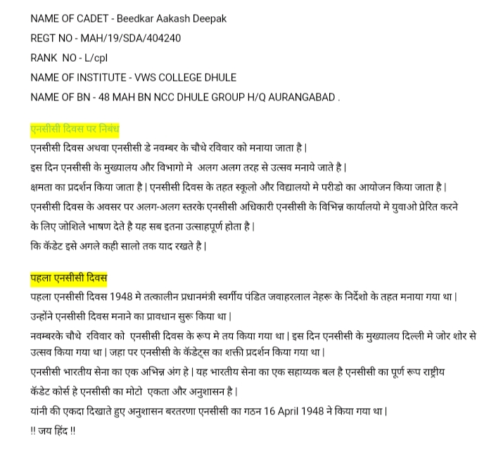 Cadet. Sanjeev A Tadasal 2/28KRBN J.G college of commerce Re. no. 535235
