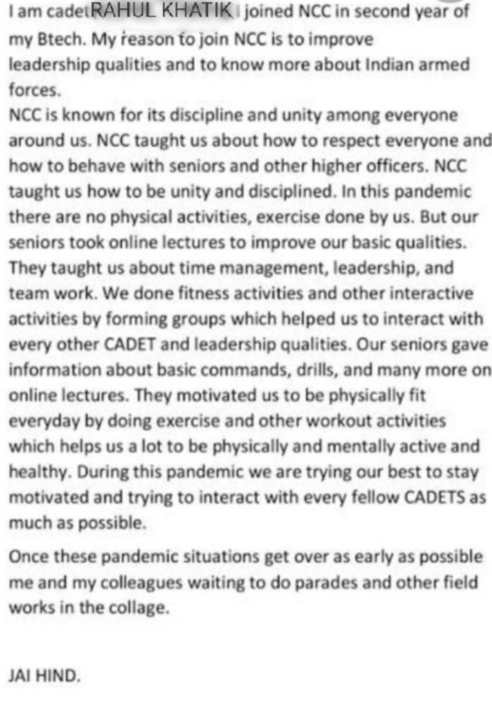 REGIMENTAL NUMBER:TN20SDF975327 RANK&NAME: FC PRANAV KANNA V NAME OF INSTITUTION : BISHOP HEBER COLLAGE TRICHY-17 NAME OF UNIT: 3TN AIR SQN(TECH) NCC