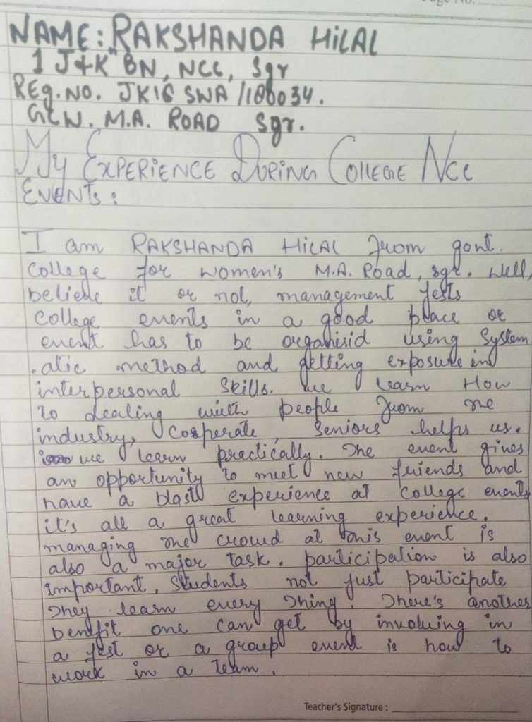 Rakshanda Hilal Women's college ma road Jk18/swa/180034 Unit 1 j&k girls bn.ncc sgr