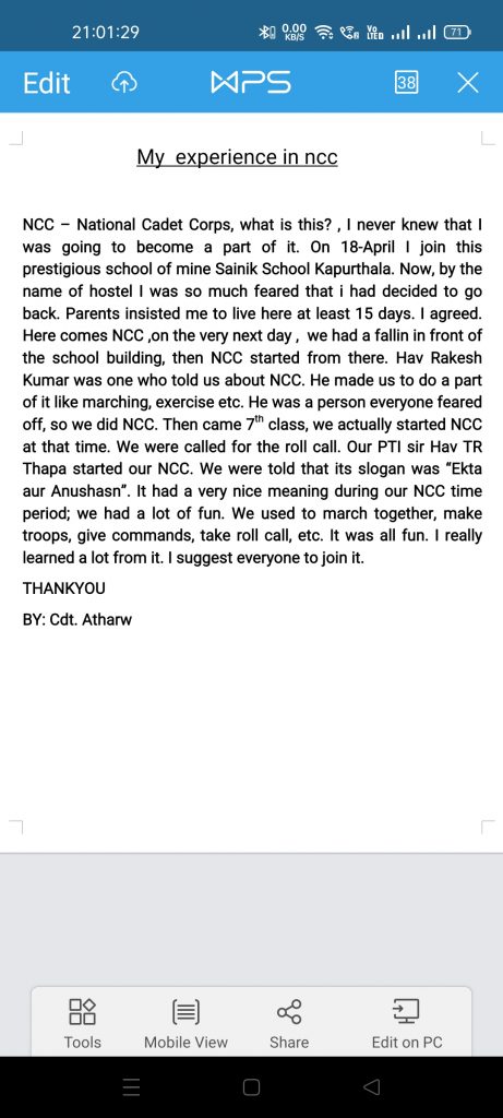 Cdt Atharv R.no-7683 Sainik school kapurthala