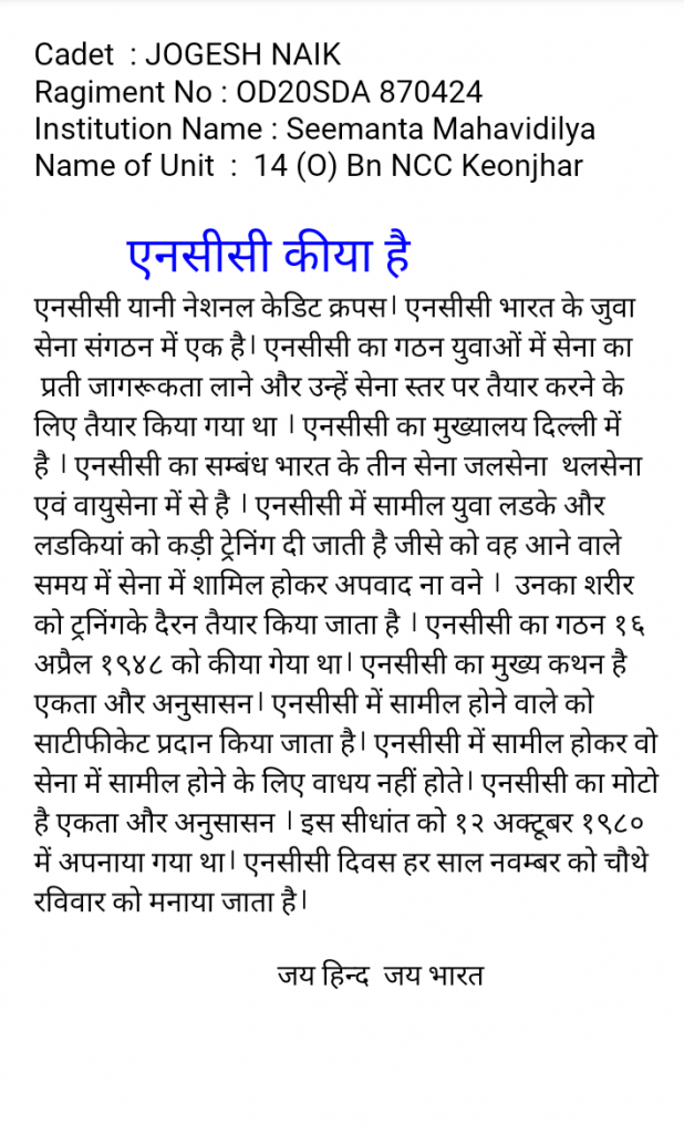 Cadet : JOGESH NAIK Ragiment No : OD20SDA 870424 Institution Name : Seemanta Mahavidilya Unit : 14 (O)Bn NCC Keonjhar