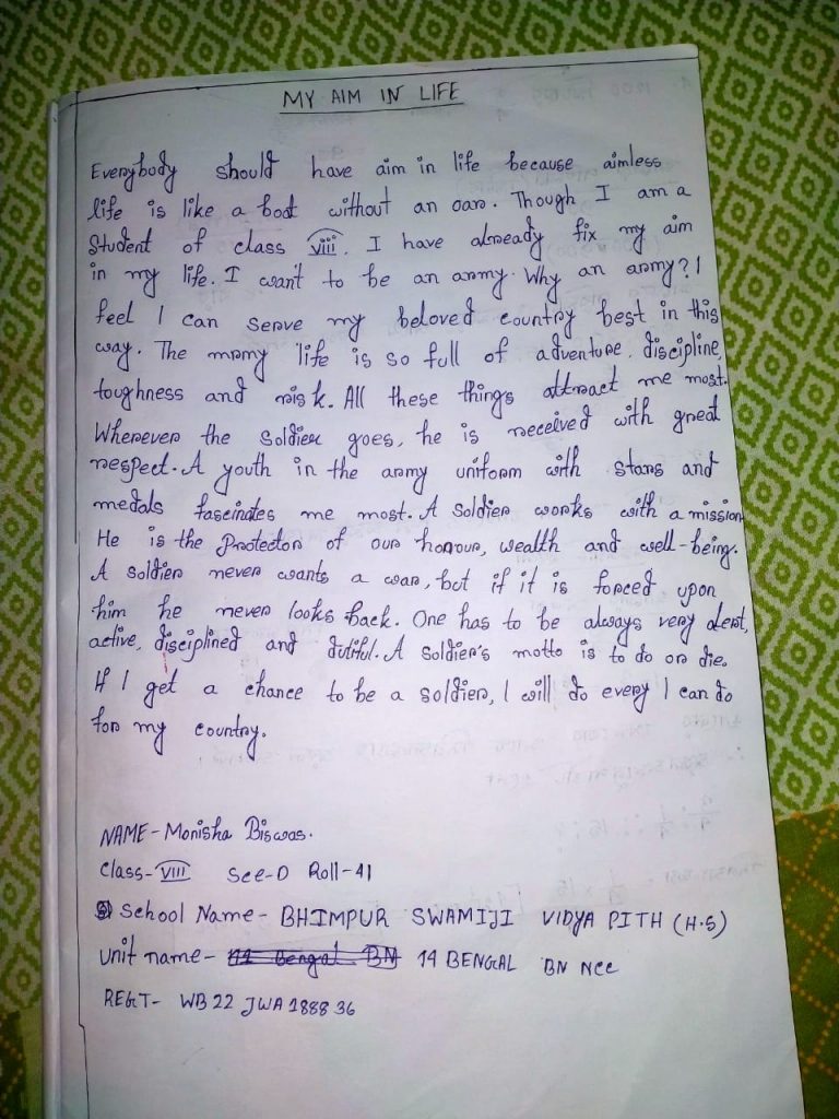 I am a NCC jwa cadet of 14 Bengali BN NCC. My Regimental number and name is WB 22jwa188836 , Monisha Biswas. My school name is Bhimpur Swamiji Vidyapith