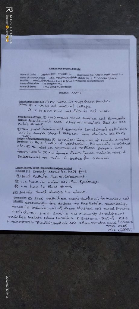 Name - JUO Sumit Kumar Roy Regt. No. - WB20SDA223013 College - Siliguri College Unit - 16 Bengal BN NCC Group - Darjeeling & Sikkim Dte - West Bengal & Sikkim