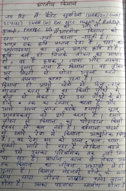 जय हिंद मैं कैडेट सुशीला आज आपको हमारे भारतीय किसानों की दयनीय दशा के बारे में बताना चाहती हूं।