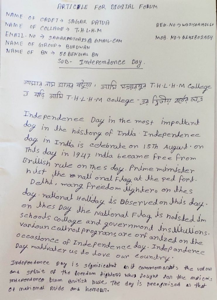Reg No - WB/20/SDA/157943, Rank - CDT , Name - Niladri Mondal, Unit - 49 BN NCC , College - Kalyani Mahavidyalaya, WB And SIKKIM