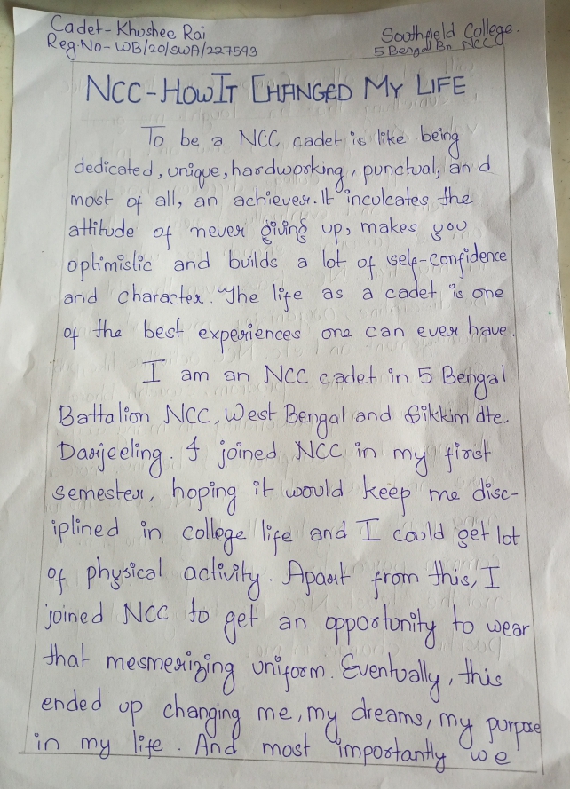 Cadet-Khushee Rai WB/20/SWA/227593 Southfield College, Darjeeling Southfield College