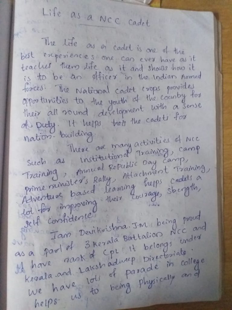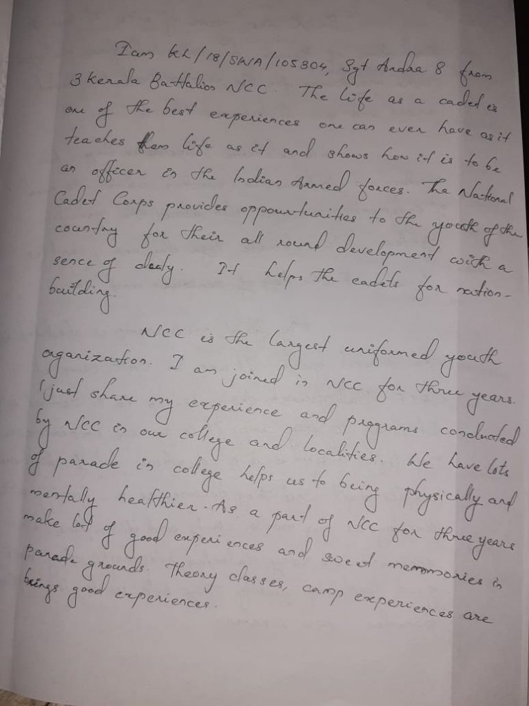 I am KL/18/SWA/105304,Sgt Ardra. S being a part of 3 Kerala Battalion NCC. It belongs under Trivandrum group and Kerala & Lakshadweep directorate. And I am so proud to be a cadet.