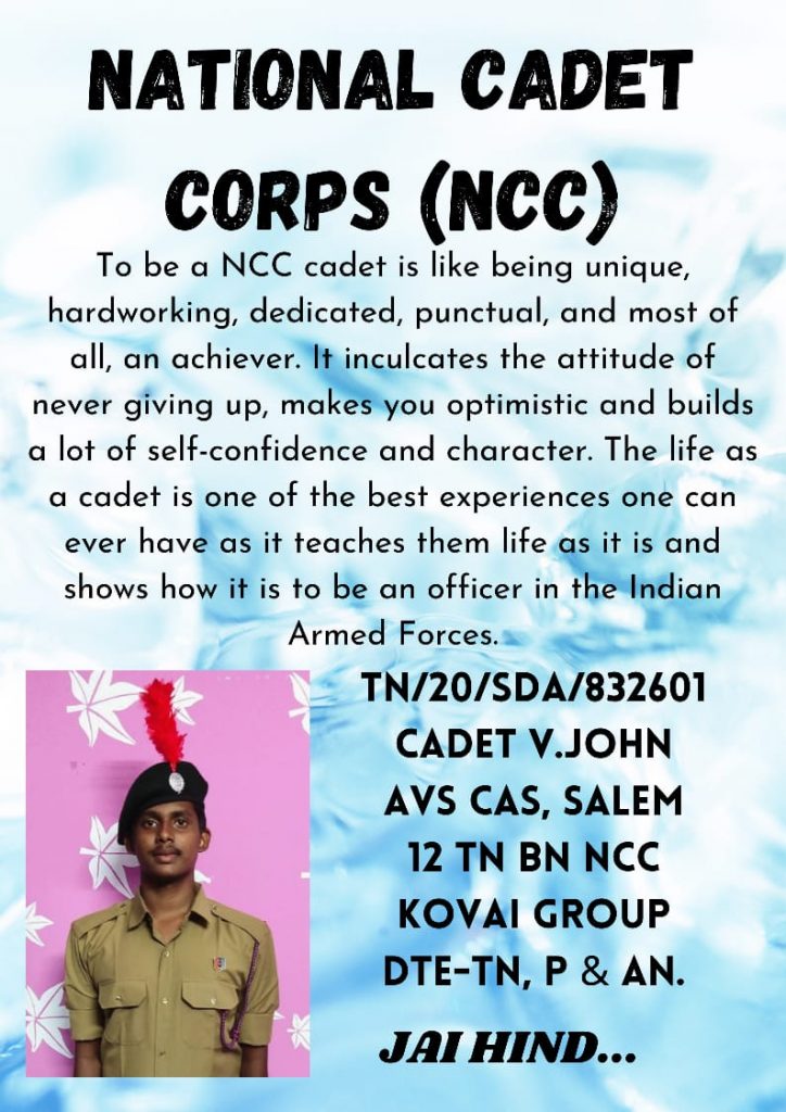 TN/20/SDA/832601 Cadet V.JOHN AVS CAS, Salem 12 TN BN NCC Kovai Group DTE-TN, P & AN.