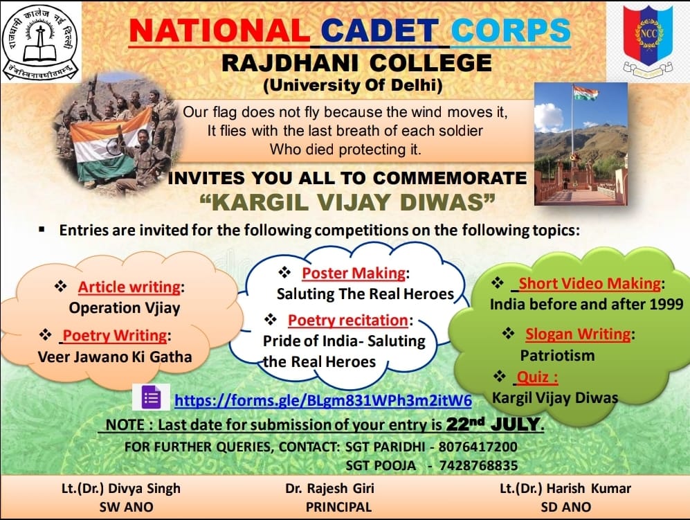 Lt Dr Divya Singh ANO, NCC RAJDHANI COLLEGE Kargil Vijay Diwas 2020-21 On the occasion of 22nd Kargil Vijay Diwas, an online session was organized by the cadets of rajdhani college (University of Delhi)