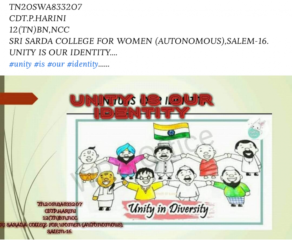 Rank&Name: CDT.P.Harinj , Reg no: TN20SWA833207 Clg name: Sri Sarada College For Women (Autonomous) , Salem – 16. 12(TN)BN NCC, KOVAI GROUP, TN,P& AN DTE . Unity is Our IDENTITY