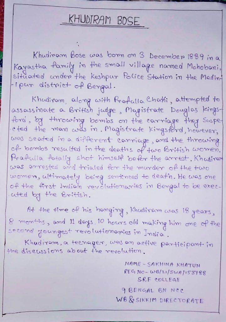 Name _ Sakhina khatun, Rank _ cadet ,Reg.no_ WB21SWA153788, Unit _ COY NO 5/9 SRF COLLEGE , BN_ 9 Bengal BN NCC, Group _ kalyani group , Dte _ West Bengal and Sikkim , Email _ sakhinak00@gmail.com