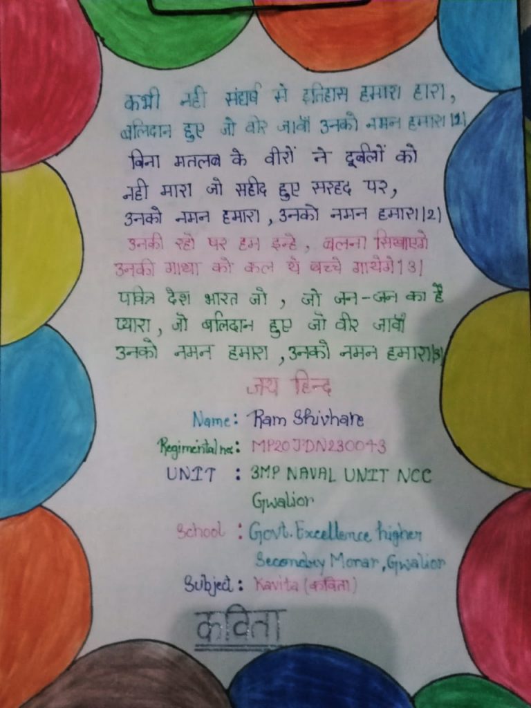 Name:Ram Shivhare Regimental no:MP20JDN230043 Unit:3MP Naval UNIT NCC GWALIOR School: High Secondary school of excellence no.1,morar