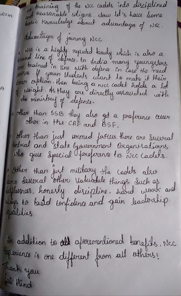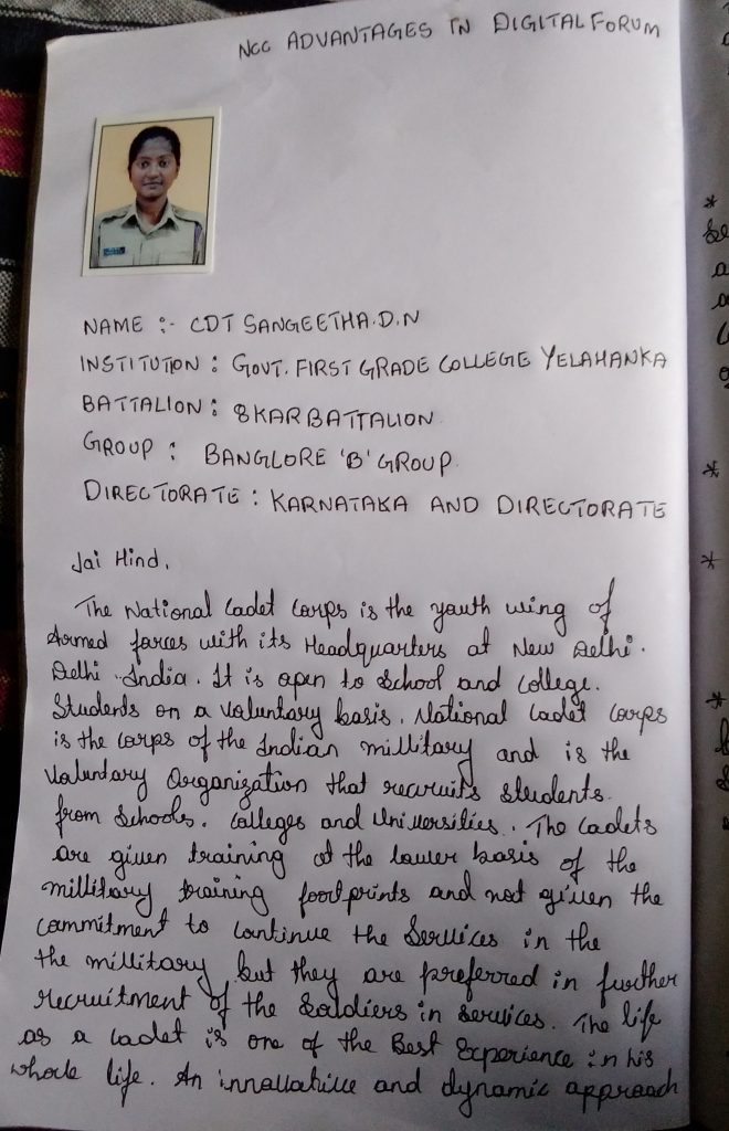 JAI HIND Iam cadet Khushi Sharma of 3 HAR G BN NCC HISAR .Here I want to share my first experience with my ano mam.