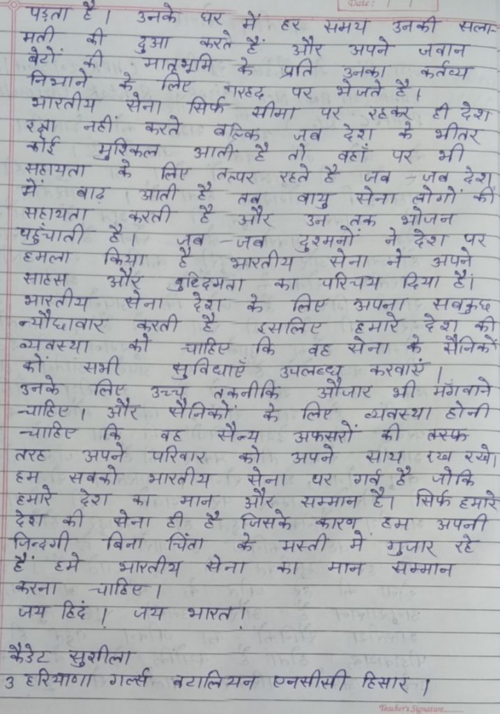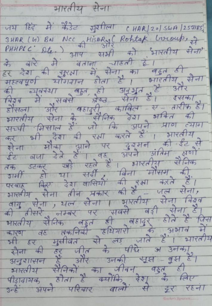जय हिंद मैं केडिट सुशीला आज आपको भारतीय सेना के बारे में बताना चाहती हूं।