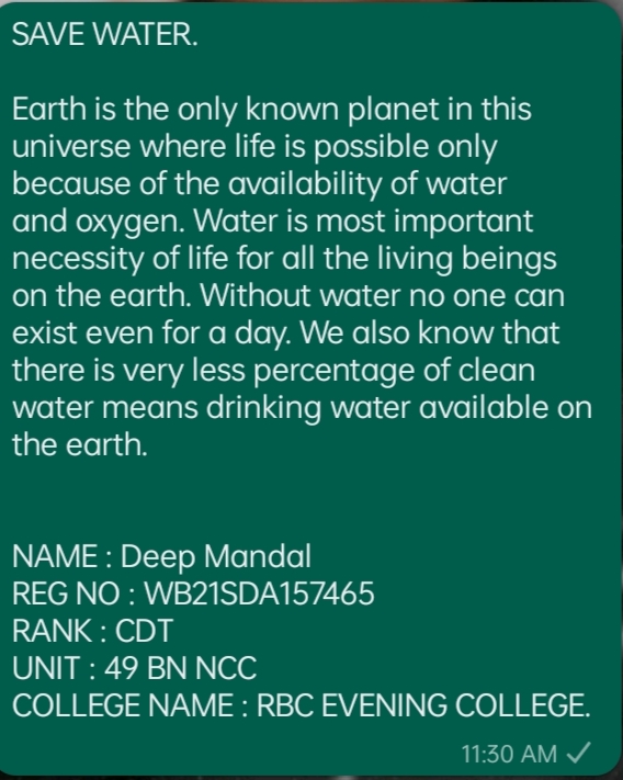 NAME : Deep Mandal REG NO : WB21SDA157465 RANK : CDT UNIT : 49 BN NCC COLLEGE NAME : RBC EVENING COLLEGE.
