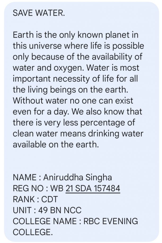 Name - Aniruddha Singha. Rank - Cadet. Reg. No - WB21SDA157484. College Name - RBC Evening College. Bat. Name - 49 Bengal NCC. Group - Kalyani.