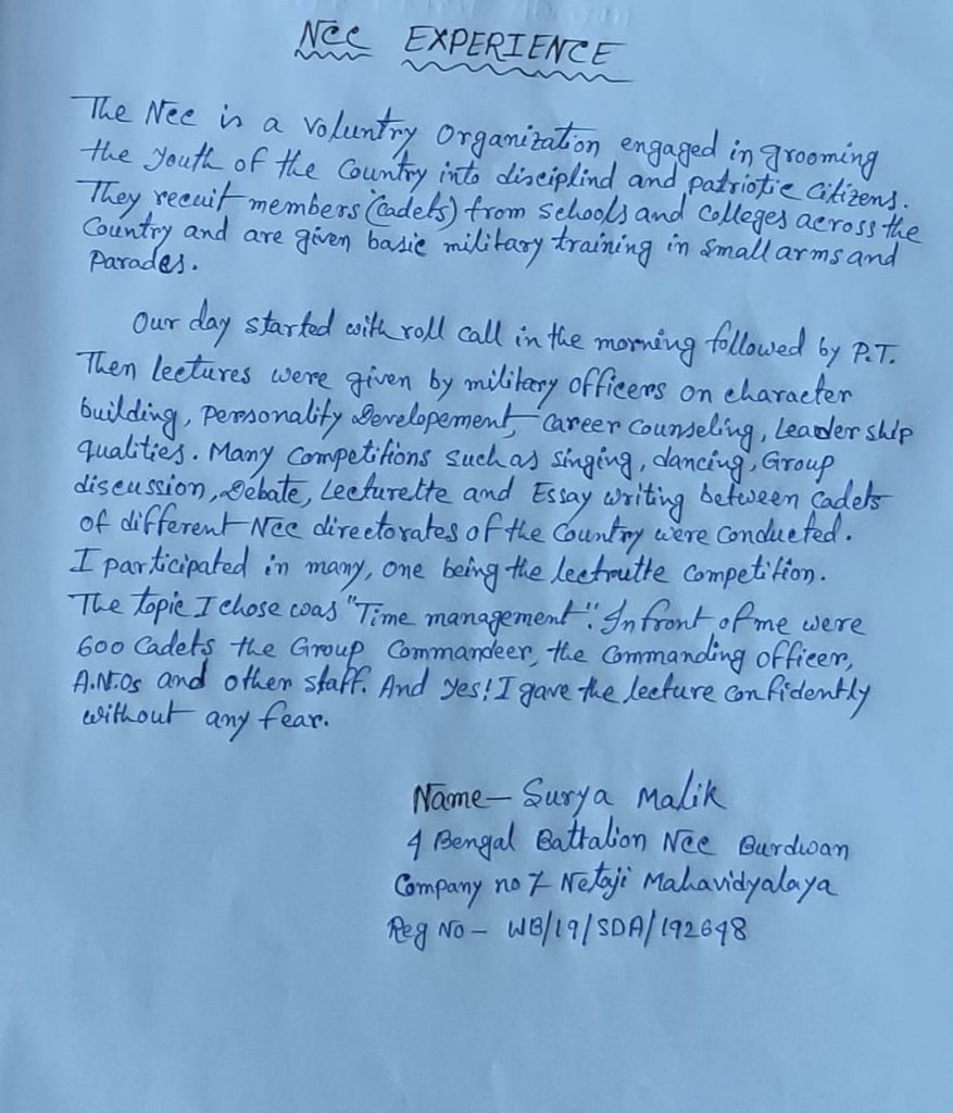 I am cadet Surya Malik . Reg.no.WB/19/SDA/192648.4 Bengal Battalion company no 7 Netaji Mahavidyalaya