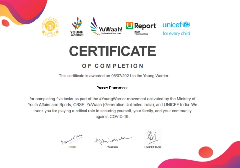 I am Cadet Pranav Pruchchhak, Cadet of Darshan University & 8 Guj Naval Unit NCC. I Complet five tasks as part of the #YoungWarrior movement activated by the Ministry of Youth Affairs and Sports, CBSE, YuWaah (Generation Unlimited India), and UNICEF.
