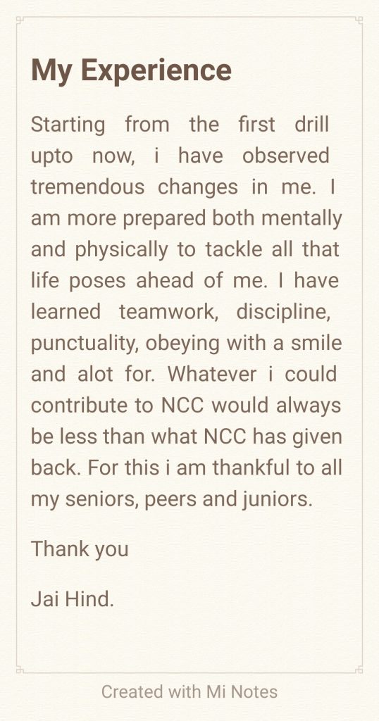 I am a 3rd year Ncc corporal of Kmc Ncc coy, 5dbn and a student at Kirori Mal College