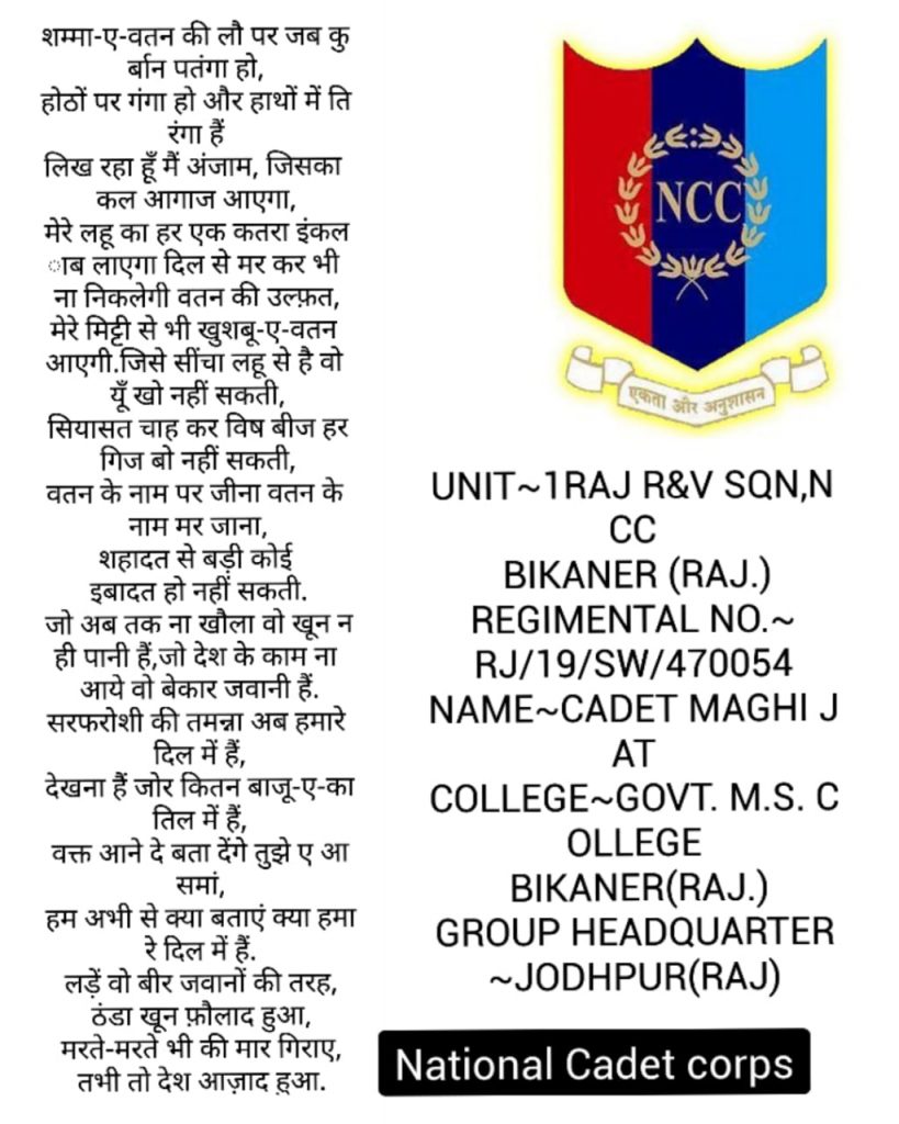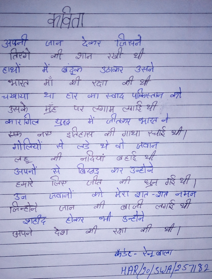मै कैडेट रेनू बाला (3हरियाणा गर्ल्स बटालियान से) आपके साथ एक कविता सांझा करना चाहती हूँ।